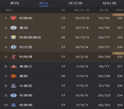 不过稍后登场的领头羊阿森纳顶住压力,他们在客场凭借埃弗顿送出的点球大礼,由哲凯赖什主罚命中制胜,以1-0力挫实力不俗的埃弗顿,各项赛事3连胜。17轮后积39分,继续以2分优势力压曼城,领跑英超积分榜。由于本轮也是圣诞节前最后1轮比赛,阿森纳成功摘得本赛季英超“圣诞冠军”。