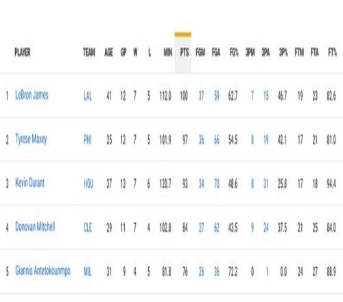 进入2026年后,第四节总得分联盟前五的球员依次是詹姆斯(100分)、马克西(97分)、杜兰特(93分)、米切尔(84分)、字母哥(76分)。